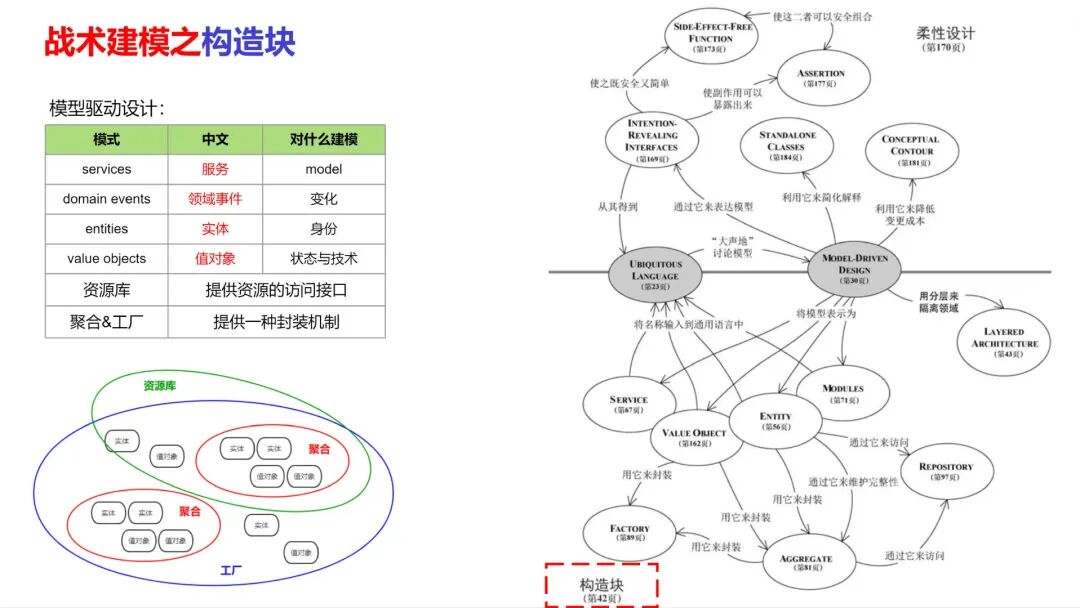 构造块:在类、对象、组合、继承等层次上对系统进行设计。按照 DDD 的术语,我们可以把服务、事件、实体、值对象归类为原子块,把资源库、聚合、工厂归类为组合块。