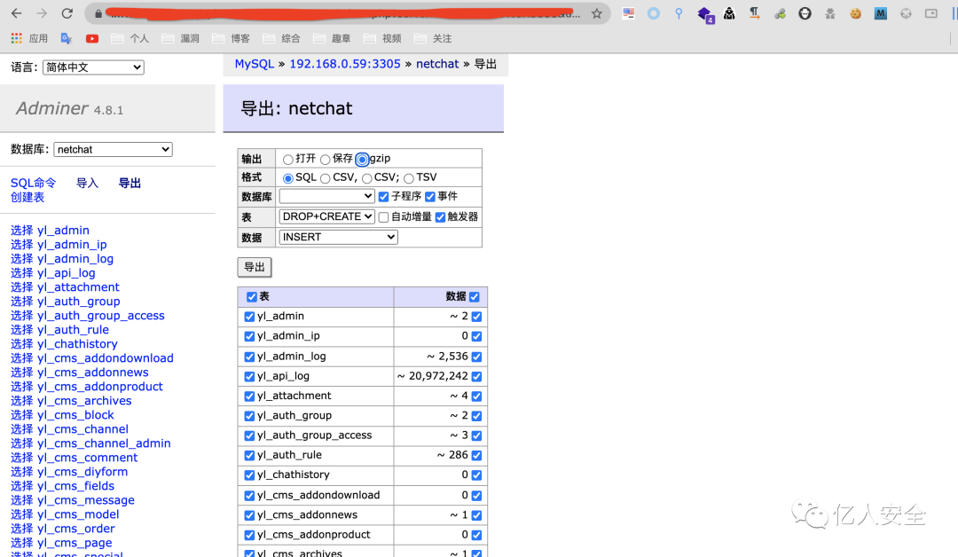 在 adminer 中选择数据库导出,将当前数据库直接打包下载