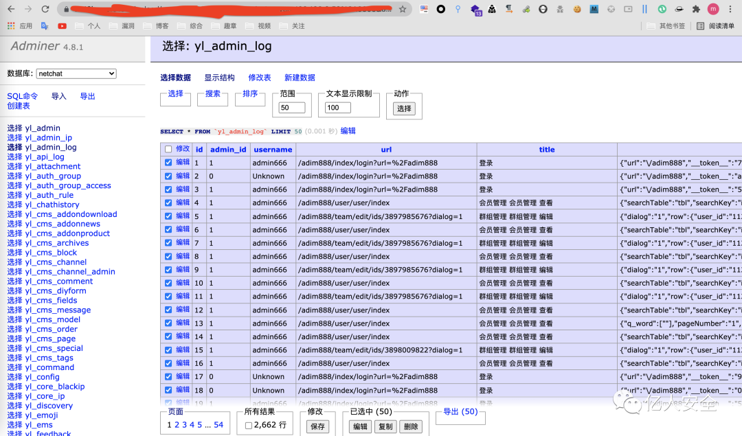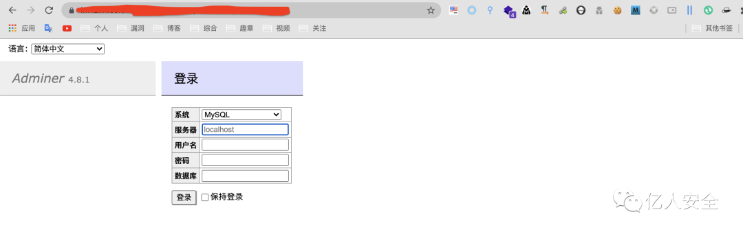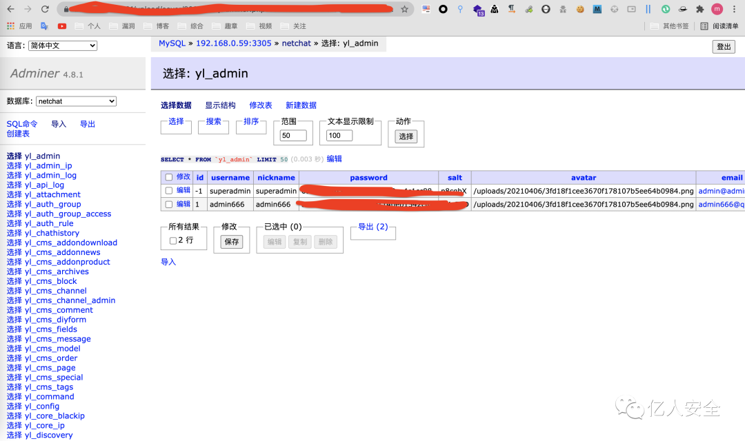 由于无法通过冰蝎无法连接数据库,我们上传 adminer 连接数据库,将服务器地址设置为192.168.0.59:3305,输入账号和密码