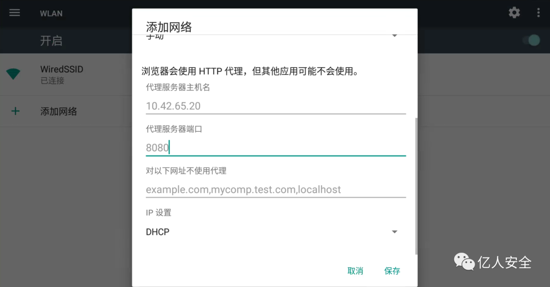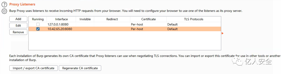 在 BurpSuite 中设置监听地址以及监听端口,其中地址为内网的IP地址设置网络中的 HTTP 代理为 BurpSuite 中的代理地址和端口