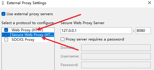 记得两个选项都要配置127.0.0.1:8080,因为我们的burp就是默认监听8080端口的,若不是8080,改成自己burp上监听的端口就可以了。