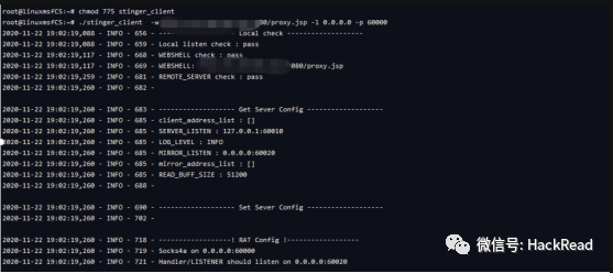./stinger_client -w http://x.x.x.x:7080/proxy.jsp -l 0.0.0.0 -p 60000。