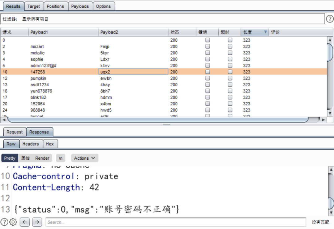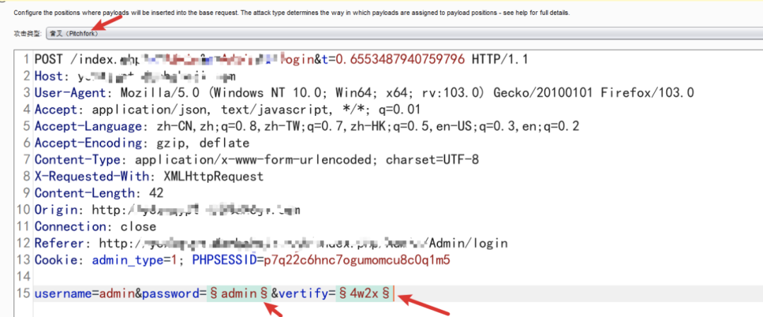 6)当以上步骤完成时,说明已经配置好了,接下来就可以进行验证码绕过爆破了,首先在登录接口输入账号密码验证码抓取请求包,发送到intruder模块,使用pitchfork攻击类型,设置密码和验证码为变量
