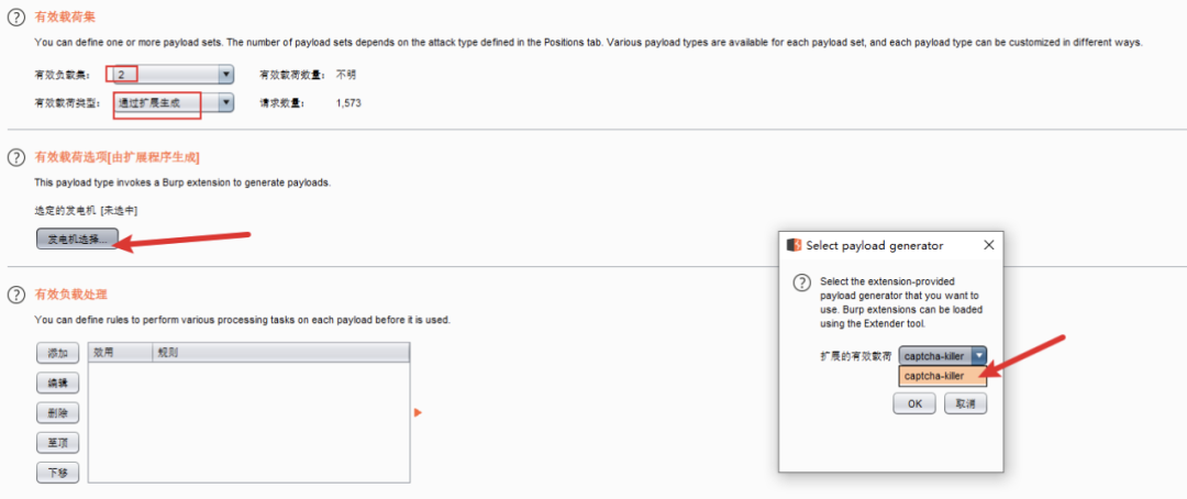 7)然后在位置一设置为密码字典,位置二选择有效载荷类型为通过扩展生成,然后选择captcha-killer这个插件扩展