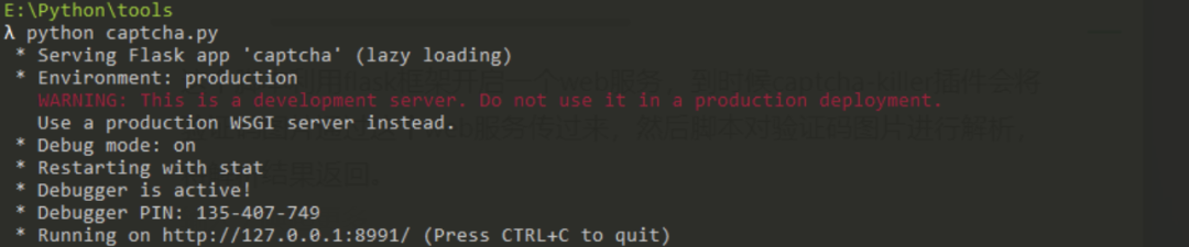 这个脚本利用flask框架开启一个web服务,到时候captcha-killer插件会将验证码图片通过这个web服务传过来,然后脚本对验证码图片进行解析,将解析结果返回。
