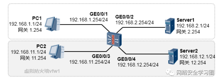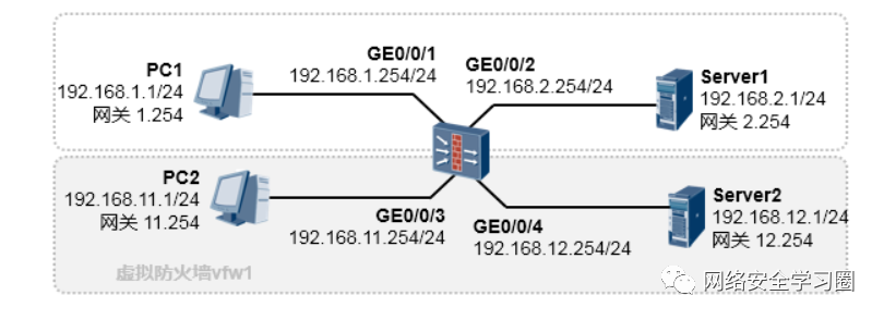 PC2与Server2属于一个敏感的业务,这个业务的流量要求与防火墙上的其他流量完全隔离,使用虚拟防火墙技术实现这个需求;