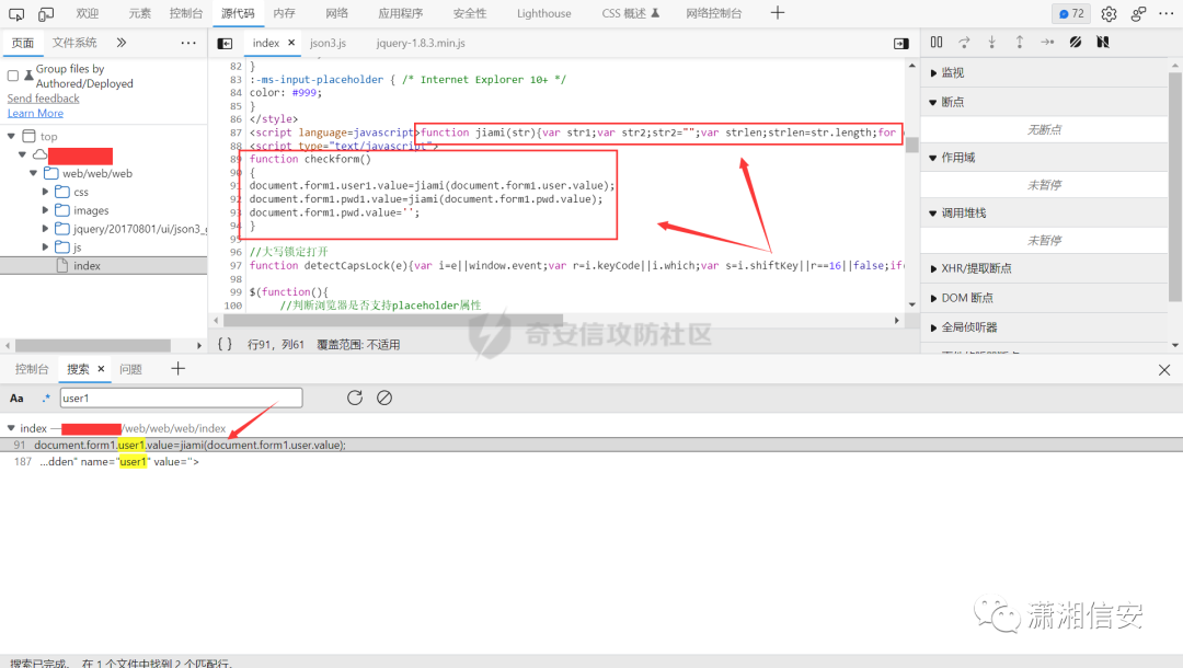 之前学过一点JS逆向,Ctrl + Shift + F,搜索被加密的参数 - user1,找到了加密函数(呜呜这个逆向好简单,丝毫没有展示出我的逆向技术)![]()