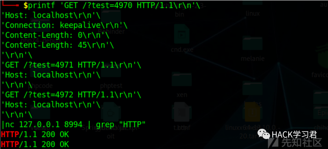 printf 'GET /?test=4970 HTTP/1.1\r\n'\ 'Host: localhost\r\n'\ 'Connection: keepalive\r\n'\ 'Content-Length: 0\r\n'\ 'Content-Length: 45\r\n'\ '\r\n'\ 'GET /?test=4971 HTTP/1.1\r\n'\ 'Host: localhost\r\n'\ '\r\n'\ 'GET /?test=4972 HTTP/1.1\r\n'\ 'Host: localhost\r\n'\ '\r\n'\ |nc 127.0.0.1 8994 | grep "HTTP" HTTP/1.1 200 OK HTTP/1.1 200 OK