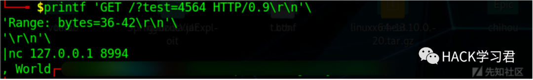 printf 'GET /?test=4564 HTTP/0.9\r\n'\ 'Range: bytes=36-42\r\n'\ '\r\n'\ |nc 127.0.0.1 8994 , World