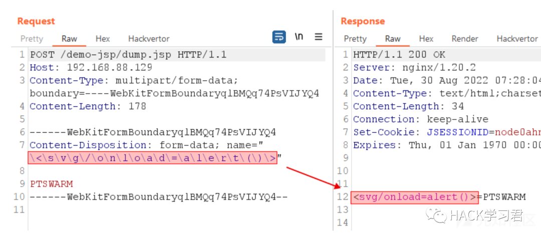 jetty从多部份请求中提取参数名称时,会把反斜杠清除,即\[any_symbol]被转换成[any_symbol]。我们可以利用该机制绕过WAF,下面使用XSS漏洞演示