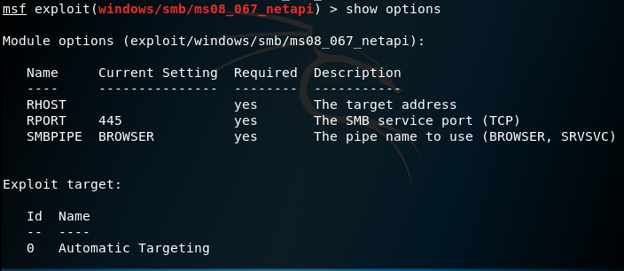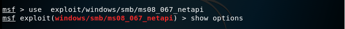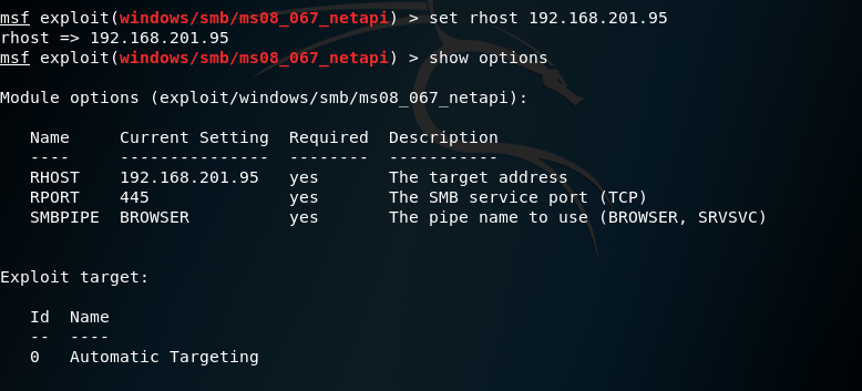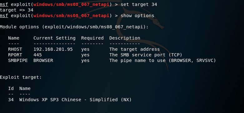 其中rhost为远程主机ip,我们设置成有ms08_067漏洞的xp系统的ip,用下面的命令进行设置。