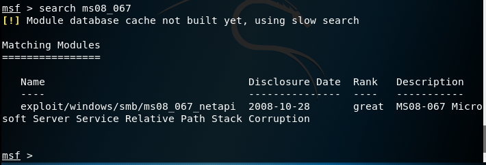 4.查找ms08_067,ms代表微软,08则代表08年发现的漏洞,067代表当年发现的第67个漏洞