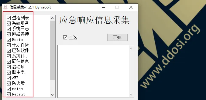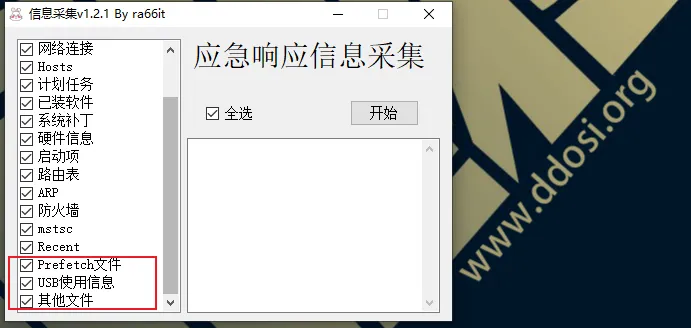 ✔️进程列表 ✔️系统服务 ✔️系统日志 ✔️网络连接 ✔️HOST信息 ✔️计划任务 ✔️已装软件 ✔️系统补丁 ✔️硬件信息:网卡、缓存、物理内存 ✔️系统启动项 ✔️路由表 ✔️ARP信息 ✔️防火墙 ✔️远程桌面(mstsc) ✔️Recent文件 ✔️Prefetch文件 ✔️USB使用信息 ✔️共享资源 ✔️用户信息及SID ✔️IP信息 ✔️近三天内修改的文件