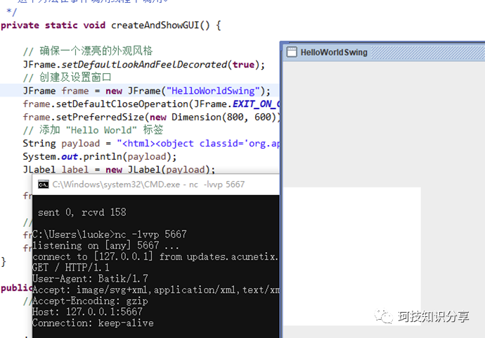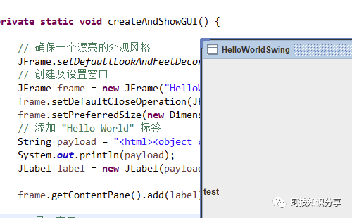 package test;import java.awt.Dimension;import javax.swing.*;public class HelloWorldSwing {private static void createAndShowGUI() {// 确保一个漂亮的外观风格JFrame.setDefaultLookAndFeelDecorated(true);// 创建及设置窗口JFrame frame = new JFrame("HelloWorldSwing");frame.setDefaultCloseOperation(JFrame.EXIT_ON_CLOSE);frame.setPreferredSize(new Dimension(800, 600));// 添加 "Hello World" 标签String payload = "<html><object classid='javax.swing.JLabel'><param name='text' value='test'></object>";System.out.println(payload);JLabel label = new JLabel(payload);frame.getContentPane().add(label);// 显示窗口frame.pack();frame.setVisible(true);}public static void main(String[] args) {// 显示应用 GUIjavax.swing.SwingUtilities.invokeLater(new Runnable() {public void run() {createAndShowGUI();}});}}