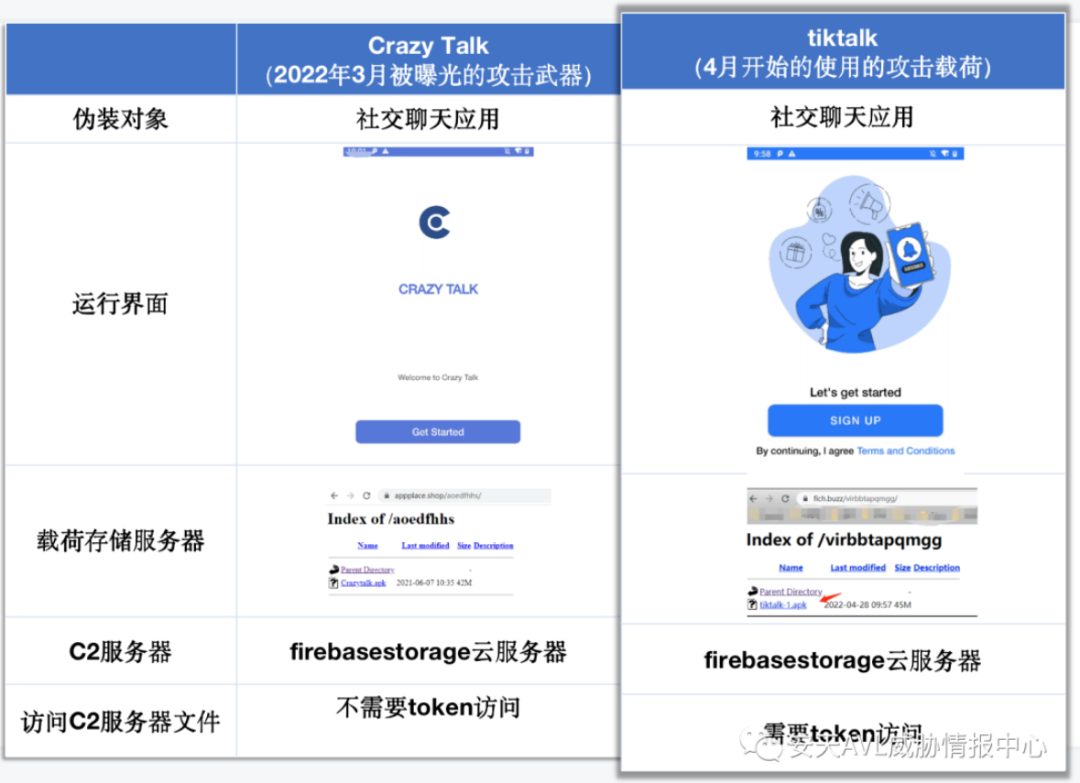 根据此次移动端攻击活动的攻击武器特征、投递传播方式、受害者特征等情况关联到南亚背景的APT组织——金刚象。本次攻击武器样本为Ahmyth高级定制版本(定制化L3mon开源木马),包含了常见的间谍木马功能,并将窃取的用户数据上传到谷歌云存储空间中。相较于该组织在3月使用的移动端攻击武器,此次攻击活动中对C2服务器文件访问做了token限制优化。两次攻击活动中被披露的攻击武器样本特性对比如下: