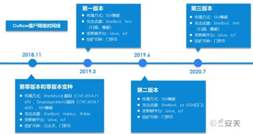 Outlaw挖矿僵尸网络首次被发现于2018年11月,当时其背后的攻击者只是一个通过漏洞入侵IoT设备和Linux服务器并植入恶意程序组建僵尸网络的组织,主要从事DDoS攻击活动,在暗网中提供DDoS出租服务。在后续的发展过程中,受虚拟货币升值影响,也逐步开始在僵尸网络节点中植入挖矿木马,并利用僵尸网络对外进行渗透并扩张,获得更为庞大的计算资源,旨在挖矿过程中获取更多的虚拟货币。