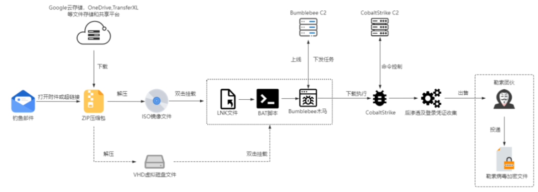 Bumblebee木马感染机器后会投递CobaltStrike,Sliver等后渗透木马,并以该主机为落脚点攻击渗透整个域内网络。攻击完成后,黑客团伙会将窃取的登录凭证或访问能力售卖给勒索团伙,投递Conti、Quantum、Diavol等勒索病毒,最终导致敏感文件泄露和主机被勒索。