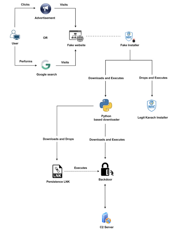 Transparent Tribe组织首先注册了多个新域并伪装成印度国家信息中心的Kavach官方应用程序的下载网页。然后通过利用Google Ads付费搜索功能,将恶意域名推送到印度用户的Google搜索结果顶部以引诱其下载木马化的Kavach恶意软件。且此次活动,攻击者最终使用了全新的数据泄露工具:Limepad,该工具基于PyInstaller的有效负载并作为打包在VHDX文件中的应用程序分发,其最终目的是窃取印度政府雇员的登录凭据。