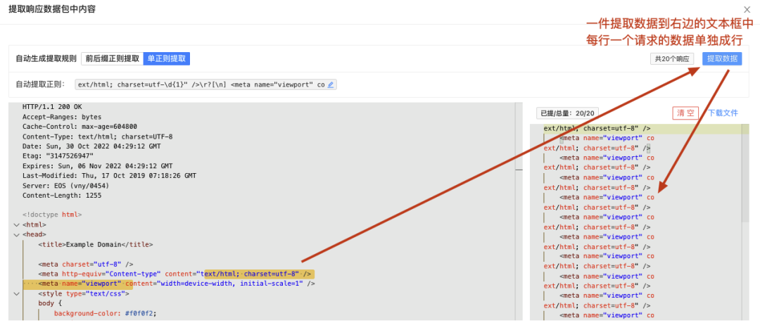 在点击右上角的提取数据后,可以在右边文本框中看到详细的提取内容,此时可以 【下载文件】 直接把提取到的数据作为txt 文本信息保存在本机,实现快速提取数据。