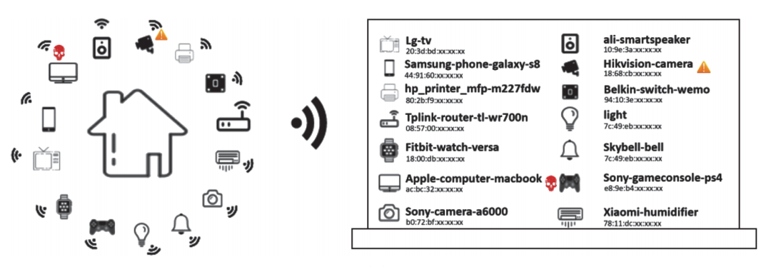 在此背景下,网络管理员需要识别联网设备的类型和型号,以便设置网络的访问规则、防火墙规则、检查是否存在已知漏洞或配置相应的入侵检测系统。同时,WiFi网络中的普通用户需要发现网络中的潜在恶意设备(如假冒网关或者隐藏的恶意摄像头),以保护自身的安全与隐私。然而,移动设备和物联网设备在加入WiFi网络时没有被强制报告自己的详细类别信息。而且,攻击者还可以轻松地通过伪造设备属性来假冒其他类别的设备或者隐藏设备类别。