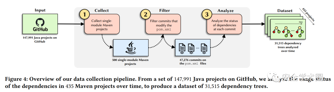 实验流程如图 3-1 所示,主要通过 collect、filter、analyze 三阶段完成纵向调研的流程。作者提出了 4 个问题来帮助引导调研方向。数据集主要包含筛选后的 435 个开源项目。