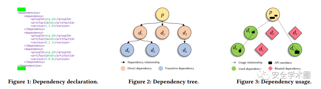 Maven dependency:Maven 依赖,简单来说就是定义项目 A 和项目 B 的一种关系,例如 A 引入 B,就会在 A 中的 pom.xml 文件写入一个定位符 <groupId, artifactId, version>,如图 1 中 Figure 1所示。