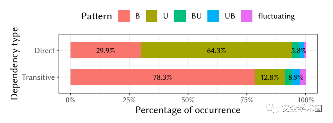 如图 3-3 所示,针对一个依赖的可能情况作者发现了 5 种可能情况。于是对其依赖的总体变化情况做了调查,结果如图 3-4 所示。