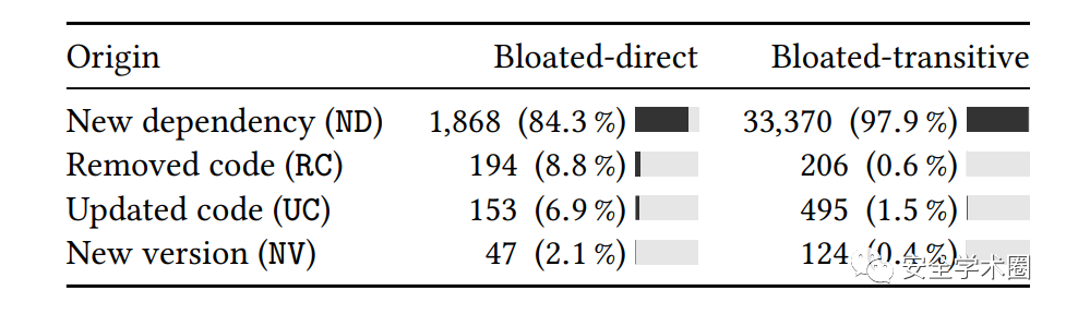 Bloated dependency:臃肿依赖,存在与依赖树中,但是未被代码所使用的依赖,如图 1 中 Figure 3 所示。
