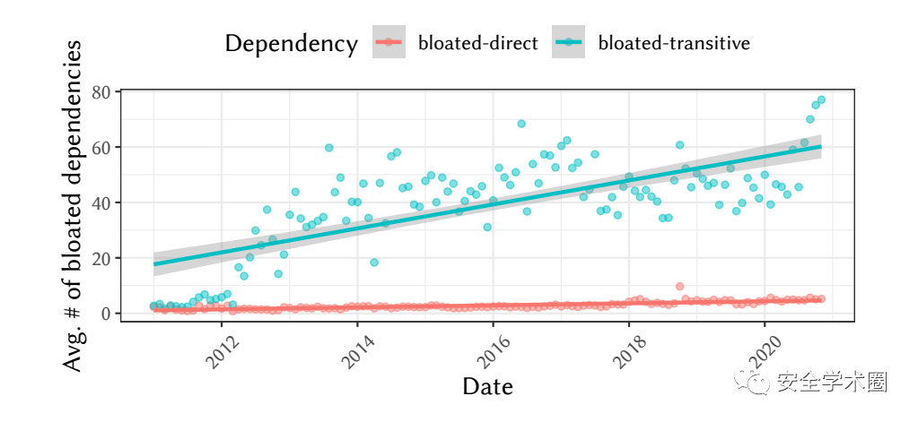 作者从 2011 年 1 月到 2020 年 11 月,每个项目中的臃肿依赖变化如图,发现直接依赖的臃肿比较平稳,而间接依赖中的臃肿不断增加。