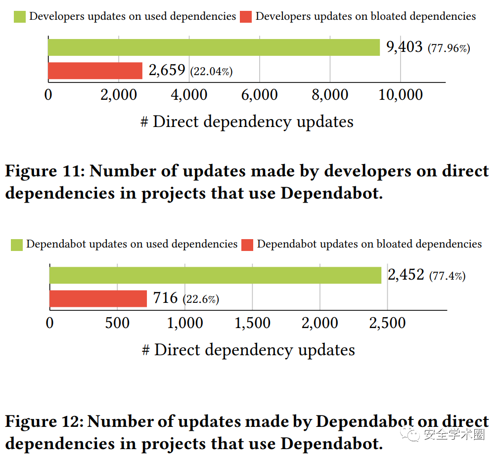 作者对比了开发人员和 Dependabot 在处理依赖更新上的情况。表明软件膨胀人为地增加了维护工作,并且依赖机器人需要改进以检测膨胀的依赖关系。