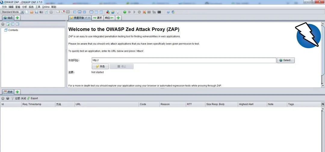 OWASP Zed攻击代理(ZAP)是世界上最受欢迎的免费安全审计工具之一,由数百名国际志愿者积极维护,它可以帮助您在开发和测试应用程序时自动查找Web应用程序中的安全漏洞,它的主要功能有:本地代理、主动扫描、被动扫描、Fuzzy和暴力破解等,以下就是ZAP的主界面,在攻击地址栏里输入目标站点域名或IP点击攻击就可以了。