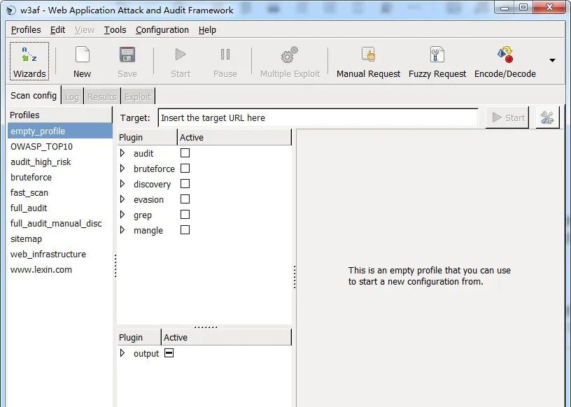 w3af是一个Web应用程序攻击和检查框架,该项目已超过130个插件,其中包括检查网站爬虫、SQL注入(SQL Injection)、跨站(XSS)、本地文件包含(LFI)、远程文件包含(RFI)等,该项目的目标是要建立一个框架,以寻找和开发Web应用安全漏洞,所以很容易使用和扩展,w3af常用的是在Linux系统下,并且已经集成到了kaili中了,能被kaili选中的,都是非常好的工具,下图是windows版的