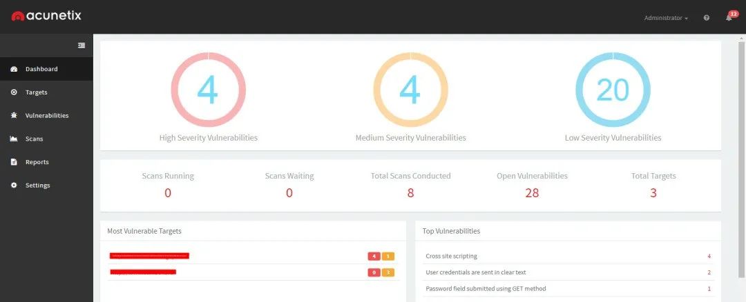 Acunetix Web Vulnerability Scanner(简称AWVS)是一款知名的网络漏洞扫描工具,它通过网络爬虫测试你的网站安全,检测流行安全漏洞,它的官方网站是:https://www.acunetix.com,我刚才看了一眼没有找到试用版下载链接,之前是有的,可以免费试用14天,当然你也可以去网上搜索破解版进行下载安装,有经济实力的朋友可以考虑购买正版软件,下图就是AWVS的主界面,里边还保存着我扫描过的两个站点,发现了4个高危漏洞,4个中危漏洞和20个低危漏洞。