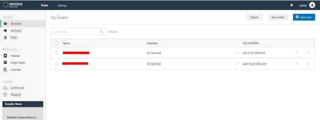 Nessus 是目前全世界最多人使用的系统漏洞扫描与分析软件。总共有超过75,000个机构使用Nessus 作为扫描该机构电脑系统的软件,其官方网站为:https://zh-cn.tenable.com,它有免费试用版和付费版,当然也可以到网上搜索下载,有经济实力的朋友可以考虑购买正版软件,下图就是Nessus的主界面,同样保存着我之前扫描过的两个站点。