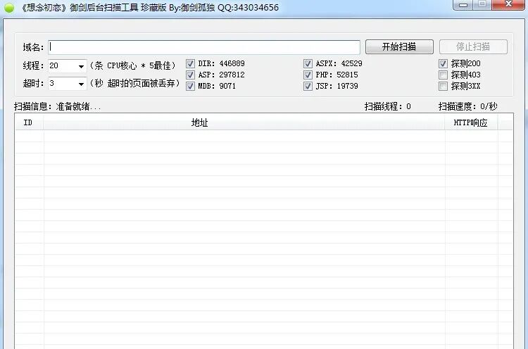御剑后台扫描珍藏版是T00LS大牛的作品,方便查找用户后台登陆地址,附带很强大的字典,字典也是可以自己修改的,使用方法也非常简单,只需要在“域名框”输入你要扫描的域名即可,用户可根据自身电脑的配置来设置调节扫描线程,集合DIR扫描、ASP、ASPX、PHP、JSP、MDB数据库,包含所有网站脚本路径扫描,默认探测200 (也就是扫描的网站真实存在的路径文件),我在之前信息收集工具介绍中也提到过御剑,其实是想介绍御剑指纹识别系统的,现在已经更改,在域名栏输入目标站点域名点击扫描就可以了,如果前期信息收集全面,可以选择站点后台语言,