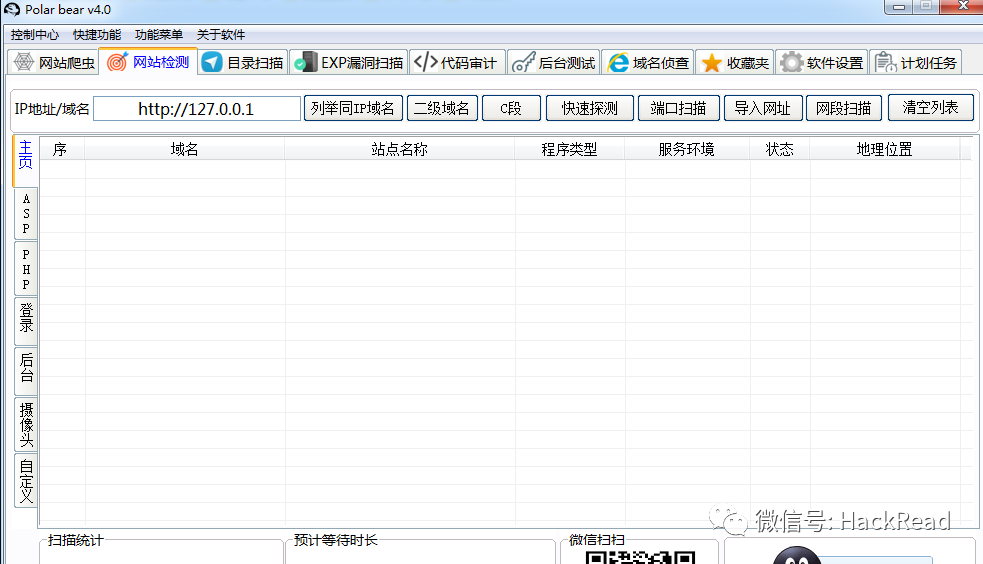 北极熊是一款综合性的扫描工具,前期的信息收集我们也提到过,那里我们说它是一款爬虫工具有些片面了,也许是我经常用它来爬虫,其实它也集成了网站检测和漏洞扫描功能,只不过它得一步一步的使用,首先对目标站点进行爬虫,再将爬虫过的结果导入网站检测当中扫描,也可以根据前期信息收集情况,选择对应的选项,提高扫描效率,北极熊扫描器也可以通过网上搜索下载