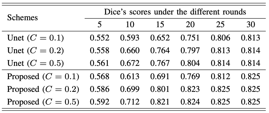 将LIDC数据集的样本分成5个子集,作为共享的公共数据分发到客户端。同样,AH-LUTCM数据集也被划分为5个子集作为私有数据。作为基线方法,将原始的U-Net与所提出的分割模块进行了比较。在本实验中,所有子集的数据分布都是IID。参考的掩码来自LIDC数据集和AH-LUTCM的三位专家放射科医生的手动逐体素掩码。客户数量设置为40。与C=0.1、0.2、0.5(C为客户数量)的定量比较列于表1。