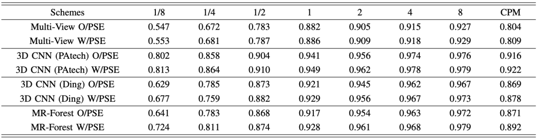 尽管在分割结果的比较中没有明显的优势,但通过对结节图像的预分割提高了检测性能。正如表3所示,3D对应物以更高的CPM分数给出了更令人印象深刻的表现。它们更好的表现得益于更丰富的空间背景和完整的体积结节表示,而没有劣质的分割输入。在没有预分割模块的情况下,这对3D视图对应物的性能提高了0.66%和1.04%。在比较的最后一行,MRForest的分数为0.892,比没有PSE模块的版本高出约2.41%,更接近PATech提出的largest schemes。PSE模块为提高性能提供了最大的帮助,它可以利用EHR的信息来锐化具有突出恶性表征的部分子图像。考虑到后者的商业用途,使用一种更轻量级的解决方案来解决未来在健康物联网(IOT)上的应用,从而获得了有前景的性能。