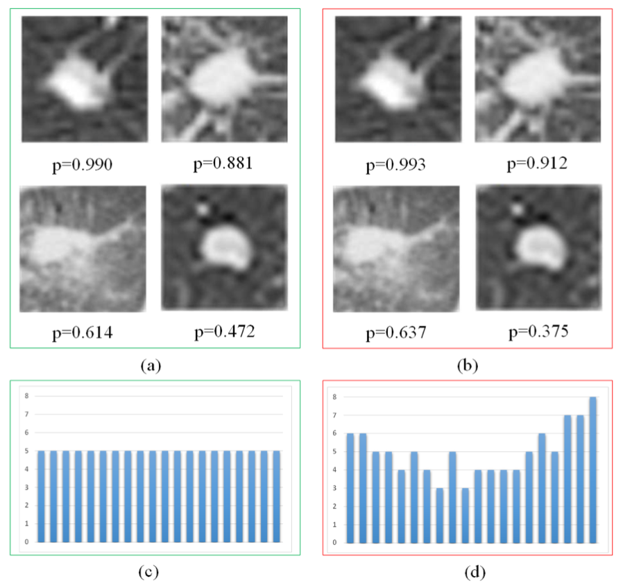 为了将原始MR-forest与基于所提框架的改进版本进行案例比较,图3-a和3-b给出了给定案例下的两组p值。值得注意的是,红色框中的p值高于绿色框中的p值。随后,以0.05的步幅将测试集分成20个bin,从每个bin中随机抽取5个样本。通过观察所选样本的输出值,发现一部分样本正在向直方图的两侧移动。这主要是因为在对整个体积结节进行基于球谐函数的拟合过程中,球形体素的变形会加剧,从而得到了更有希望的分割结果。