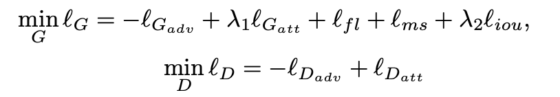其中,μ和Σ表示均值和标准差。βs和γs是m级尺度的两个权重。C1和C2是两个小常数。结合对抗性损失(ℓadv)、焦点损失(ℓfl)、属性损失(ℓatt)、IoU损失(ℓiou),生成器G和鉴别器D的混合目标损失可定义为