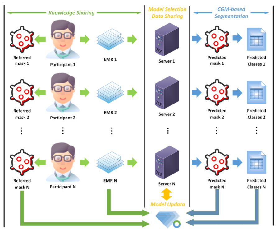 在图2中,服务器根据计算能力从上层服务器下载,并使用它们以刷新其本地模型。每个知识提供者用一对手动掩码和EMR对输入图像进行标注,用于训练局部模型并提交给上层服务器进行全局同步。通过使用下载的模型,每个服务器生成输入结节的掩码,CGM预测一个软标签,用于与引用标签相比较的典型属性的程度,以更新其模型的权重和梯度。