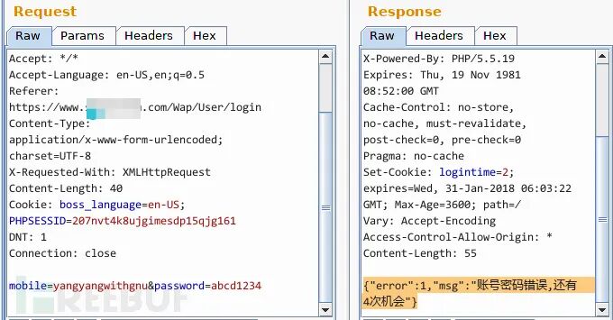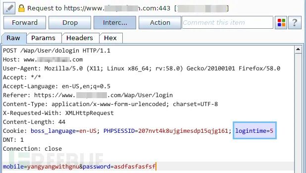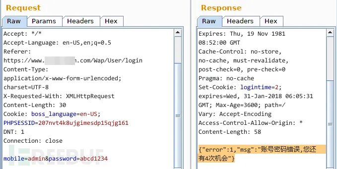 logintime 参数名和参数值引起我注意,刚好也是试错上限 5,尝试将值其改为 4 后,服务器又正常响应,或者,删除整改 logintime 后,也可绕过试错限制。