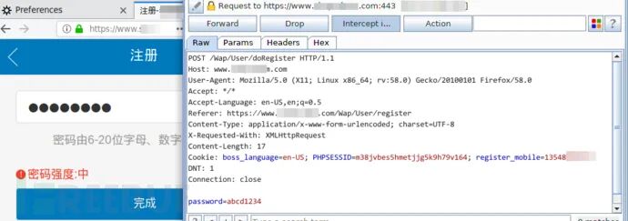其中,PHPSESSID=p6nujg7itekpau6p1e9ibbpe86、register_mobile=13908080808 这两个参数引起了我的注意。这个请求,用于重置账号 13908080808 密码,那么服务端如何知道该重置 13908080808 而不是 13908080807、13908080809 呢?刚才说的几个参数中肯定有一个用于该目的。逐一尝试发现,PHPSESSID 就是它,另外,boss_language 和 register_mobile 可删除,不影响结果。