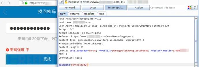这让我闻到浓郁的 cookie 混淆的味道。大致攻击思路:首先,用攻击者账号 13908080808 进入密码找回流程,查收重置验证码、通过校验;然后,输入新密码后提交,拦截中断该请求,暂不发至服务端,这时,PHPSESSID 关联的是 13908080808 账号;接着,关闭浏览器的 burp 代理,新开重置流程的首页,在页面中输入普通账号 13908090133 后获取短信验证码,这时,PHPSESSID 已关联成 13908090133 了;最后,放行之前中断的请求,放至服务端,逻辑上,可以成功重置 13908090133 的密码。