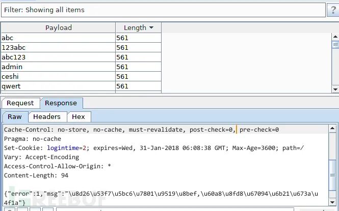 分析发现,虽然应答很类似,但还是有区别,有效账号比无效账号多了个“您”,或者,从应答体的长度也能判断出该账号是否有效。同时,服务端未限制高频访问,所以,可枚举有效账号。