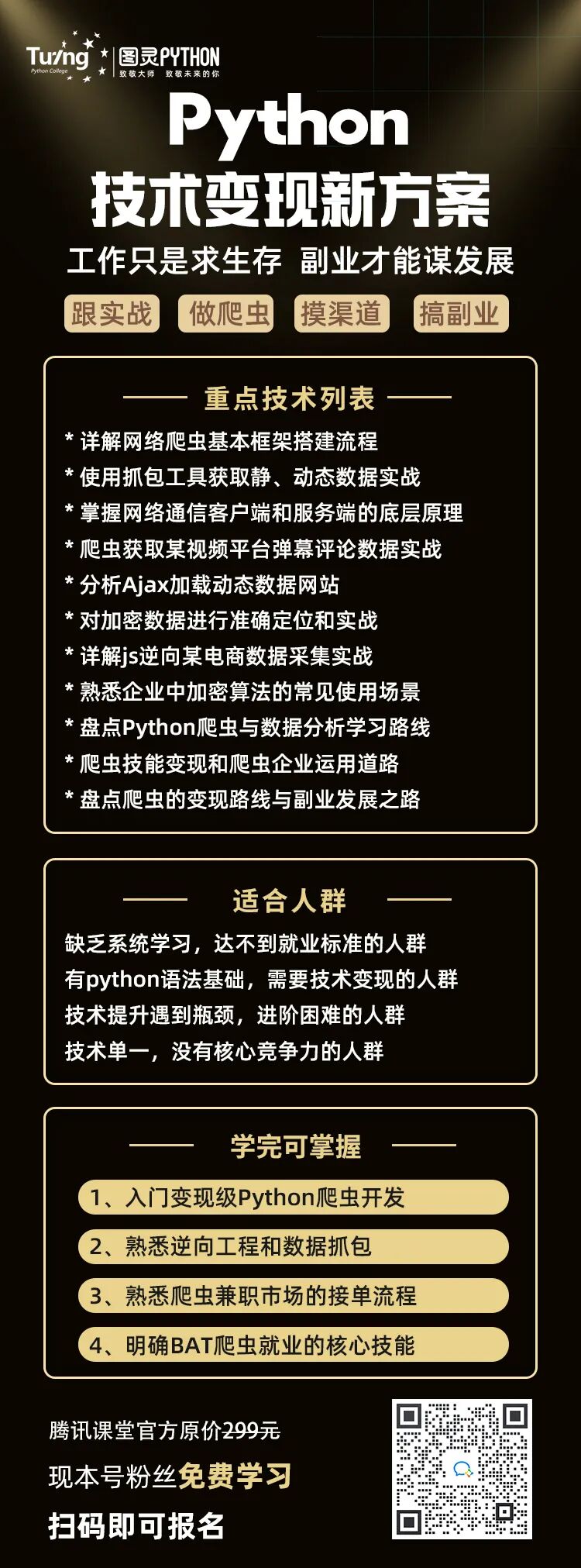 想要快速学好爬虫,尤其是可以用于变现的高阶爬虫技术,我推荐大家直接来腾讯课堂学习Python技术变现特训课。