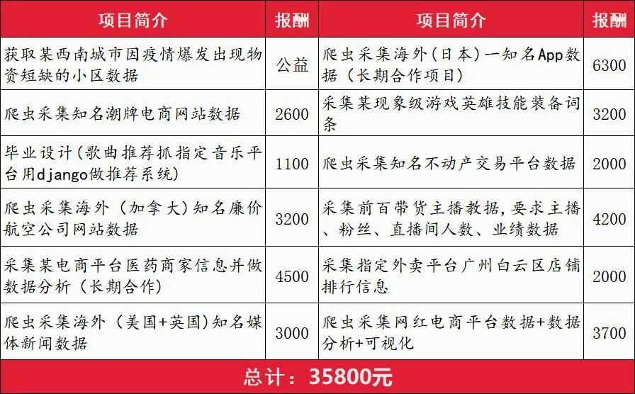 以至众多B端商家和平台对采集广大C端用户数据趋之若鹜,Python爬虫作为最好的数据采集技术,市场对它需求自然在增涨,同时水涨船高的还有爬虫服务的价格。这是近期爬虫接单记录,大家感受一下👇
